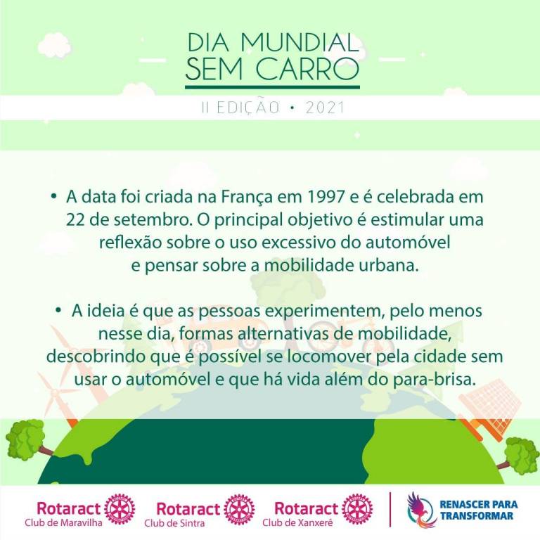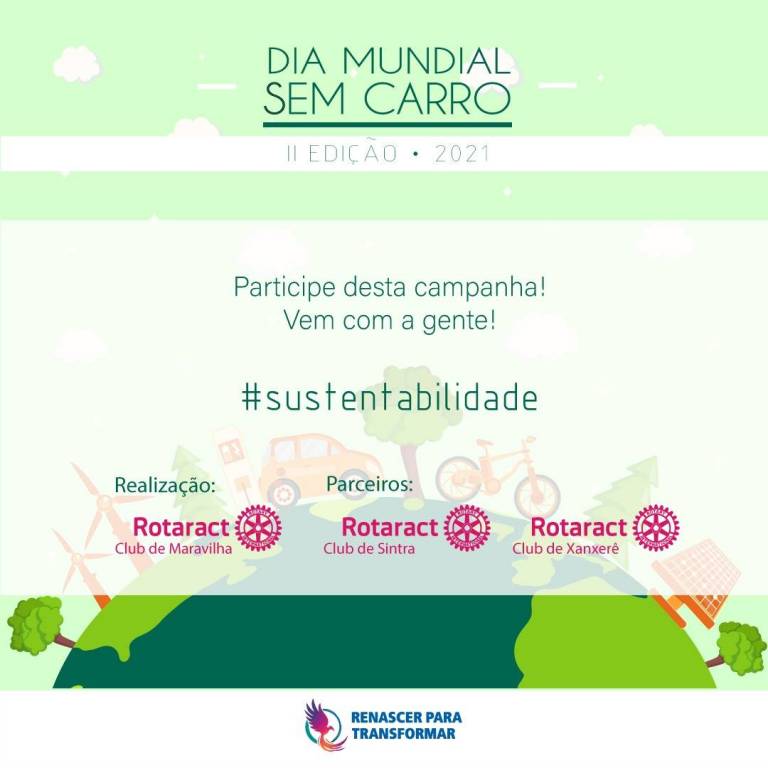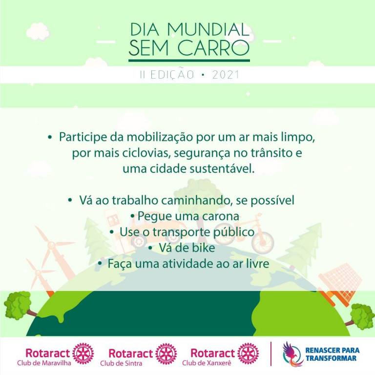 A semana do Dia Mundial Sem Carro começou. O projeto é realizado pelo Rotaract Club de Maravilha, em parceria com o Rotaract Club de Xanxerê e de Sintra – Portugal. É o segundo ano que o clube organiza o evento. A data é celebrada quarta-feira (22) e busca incentivar meios alternativos para melhorar a mobilidade urbana. Em Maravilha, uma caminhada será feita no sábado (25), às 16h30, saindo da sede do clube até a Praça dos Motoristas.